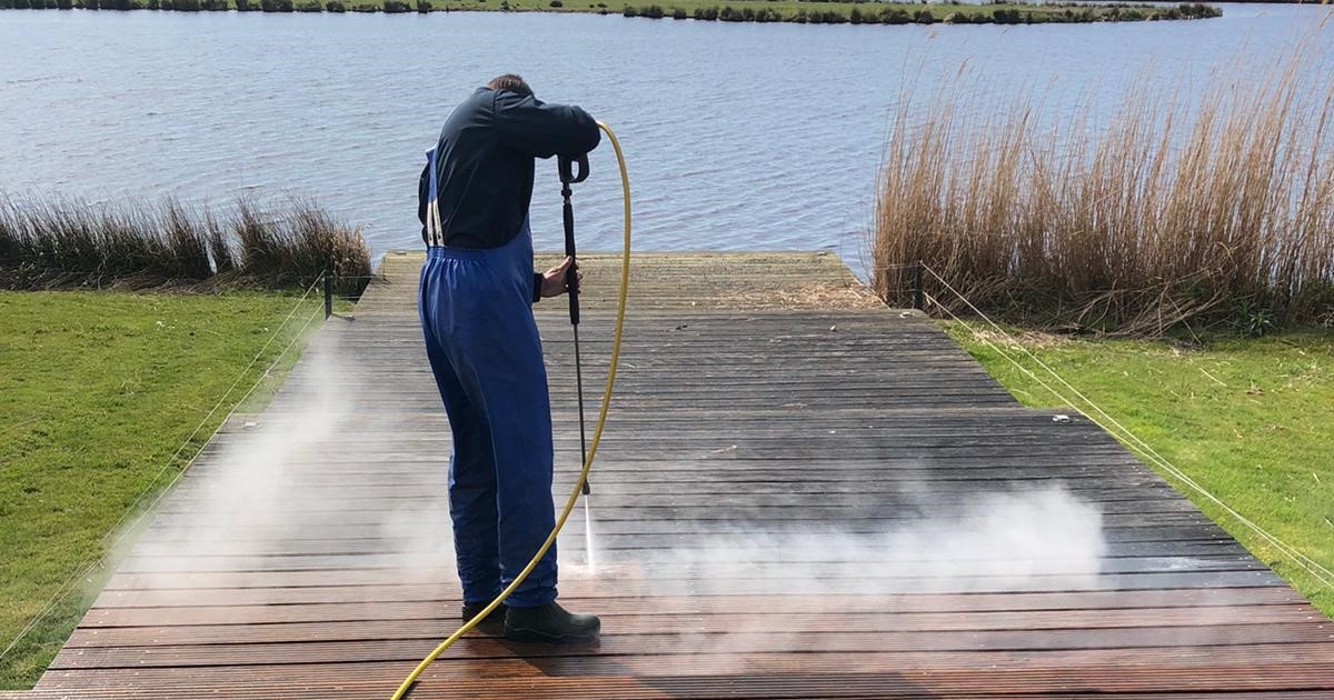 Met behulp van de stoomcleaner maakt onze medewerker deze, door onder andere het weer en algaanslag vies en glad geworden, steiger weer mooi schoon én veilig. Wel zo fijn richting het voorjaarsseizoen!